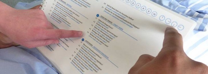 Das laminierte und somit abwasch- und desinfizierbare Ringbuch umfasst 21 Seiten. In neun Sprachen (Arabisch, Englisch, Spanisch, Griechisch, Italienisch, Niederländisch, Polnisch, Russisch und Türkisch) wurden die dringlichsten Fragen zusammengestellt und übersetzt. Außerdem helfen Symbolseiten, die vom Röntgen bis zum Blutabnehmen reichen und verschiedene Uhrensymbole beinhalten, in der Kommunikation zwischen Behandlern und Patientinnen und Patienten. Körper- und Skelettabbildungen in Kombination mit Symbolen wie Daumen hoch oder runter und eine Schmerzskala von 1 bis 10 vervollständigen die Broschüre.